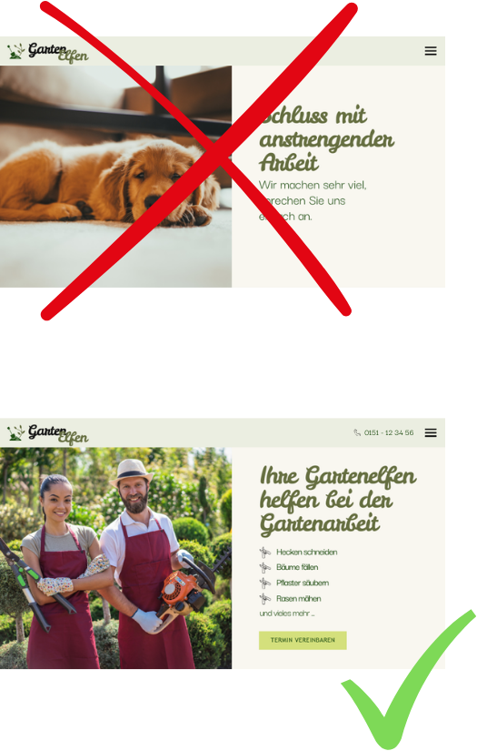 Alles, was nichts mit deinem Angebot zu tun hat. Niedliche Motive, private Bilder oder lustige Szenen, die zwar sympathisch wirken, aber keinerlei Bezug zur Dienstleistung haben.